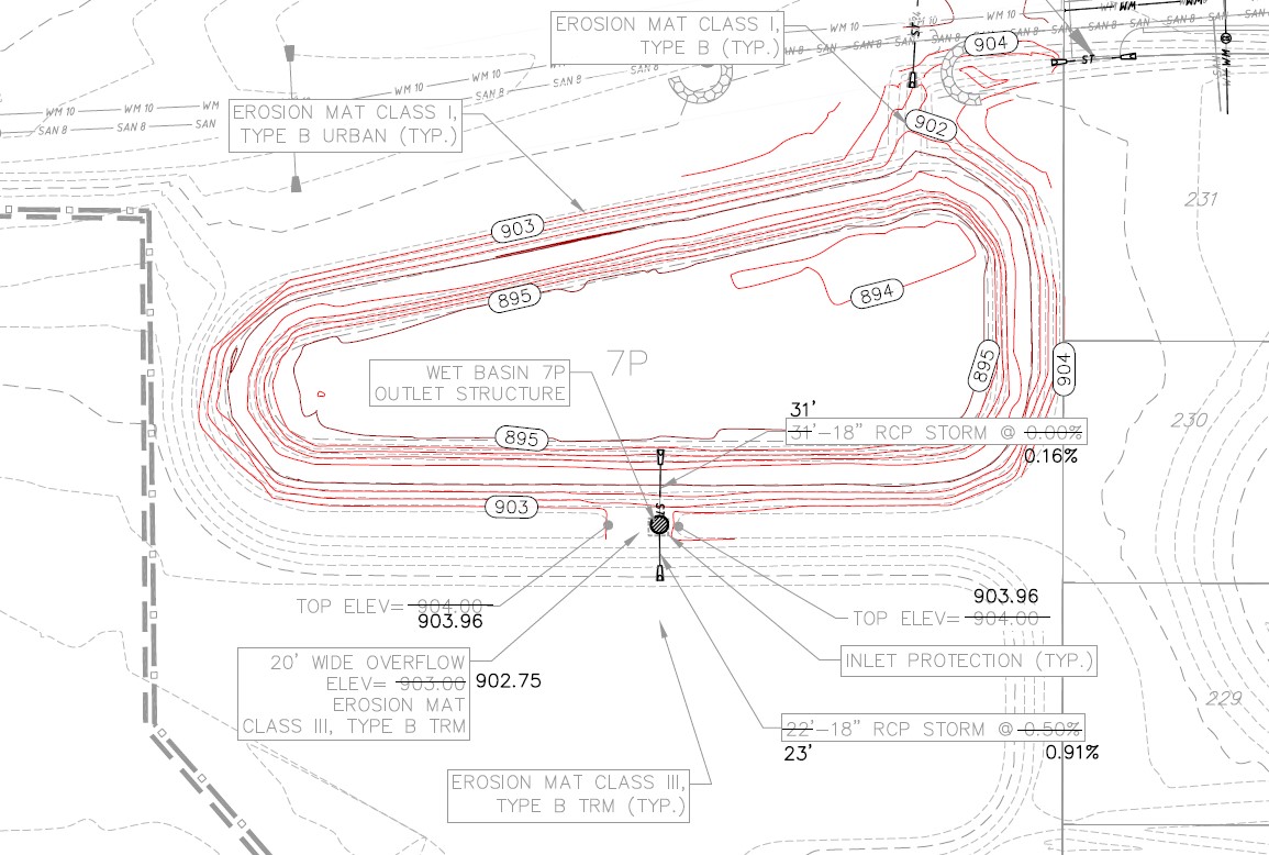 - Surveyed contours/elevations overlain on approved design. It is helpful to display the design contours in gray and the as-built contours in black or red. For plans with stormwater basins, include a storage summary table (proposed vs. as-built) on plan. Exclude extraneous information and hatching which makes the drawing difficult to read. See examples below.
